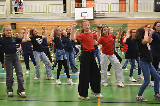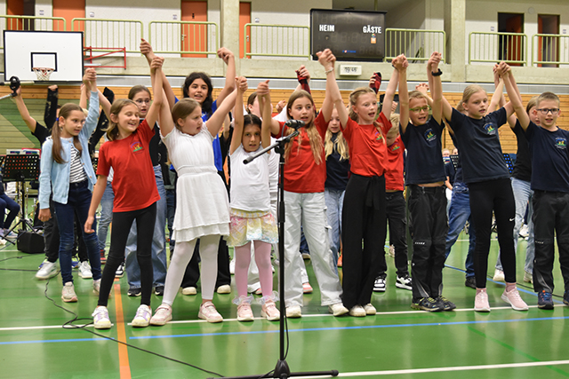 Als zertifizierte „Musikbegeisterte Grundschule“ zeigte die Schule, wie intensiv musische Bildung dort gelebt wird. Unterstützt von engagierten Lehrkräften hatten die Kinder in den Wochen zuvor in den Klassen und Arbeitsgemeinschaften Tänze, Lieder und Instrumentalstücke einstudiert. Von mitreißenden Beiträgen der Bläserklasse unter Leitung von Ingrid Menzel über rhythmisches Klatschen bis hin zu akrobatischen Darbietungen und Tänzen – das Publikum war begeistert, vom „Boogie Woogie“ der Erstklässler ebenso wie vom „Born to be wild“ der fortgeschrittenen Bläser. Die Fünftklässler ehrten mit ihrem Lied alle „Omas“ im Saal, während die Viertklässler ihren im Schullandheim entstandenen fetzigen Tanz zum Besten gaben. Besonders „cool“ präsentierten sich bei ihrem Auftritt die 2a und 3a. Die Musikpraxis-Gruppe schlug mit dem Song „Hand in Hand“ leisere Töne an und warb für menschlichen Zusammenhalt und Frieden. Mit dem Lied „Grias di“ setzte die Klasse 3b ein Zeichen für den schwäbischen Dialekt. Ein Höhepunkt von vielen war das gemeinsame Finale mit dem französischen Tango „Chaud Chocolat“.